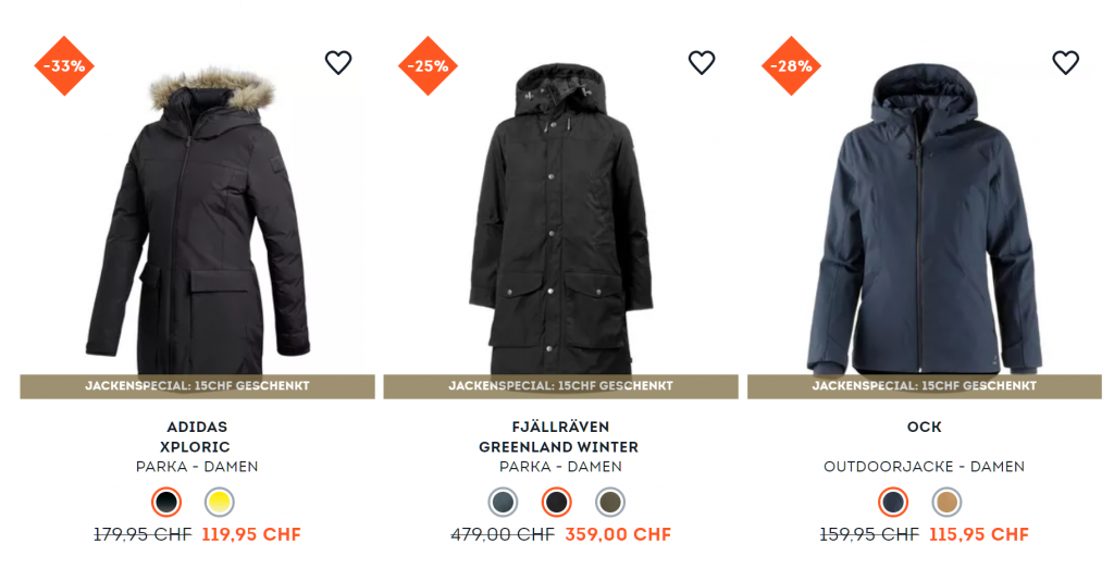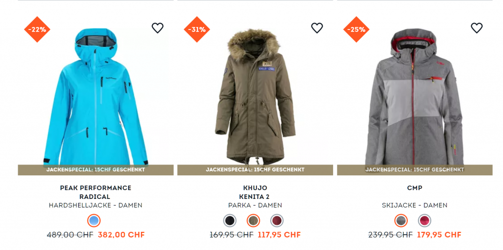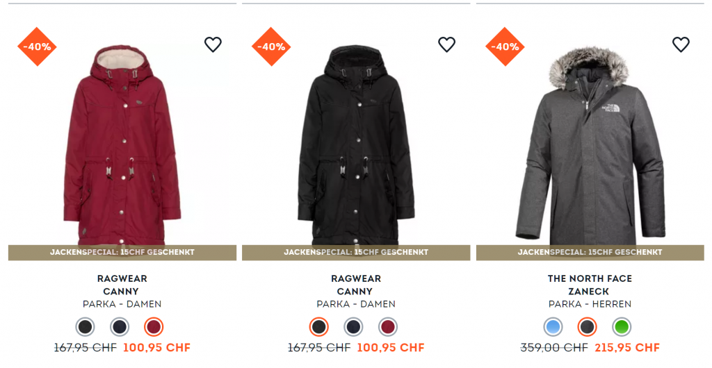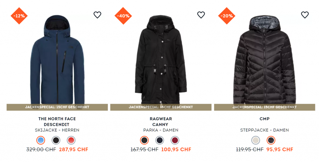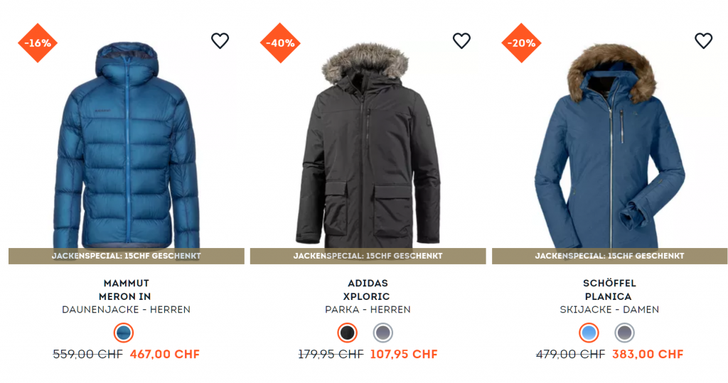 Bei SportScheck gibt’s mit dem Gutscheincode WARM15 gerade 15.- zusätzlich auf viele bereits reduzierte Winterjacken. Die Aktion läuft noch bis und mit Sonntag. Der Versand ist ab 99 Franken Bestellwert gratis. Hier einige Beispiele: