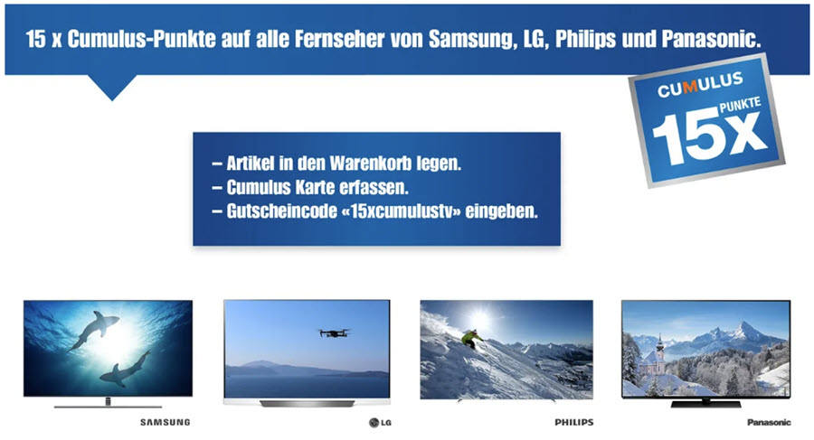 Momentan gibt es bei melectronics mit dem Rabattcode 15xcumulustv 15-fache Cumulus-Punkte beim Kauf eines TVs von Samsung, LG, Philips oder Panasonic. Wendet man nun noch den CHF 10.- Newslettergutschein an und rechnet die Cumuluspunkte in CHF um, so kommt man auf diverse Bestpreise bei den TVs.