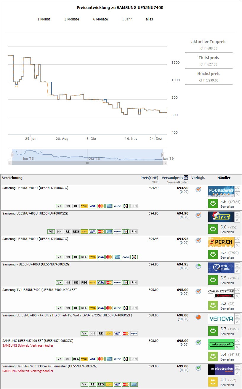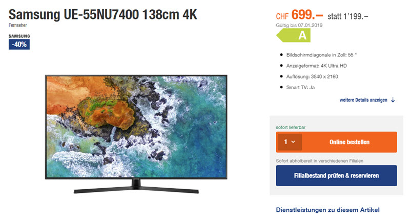 Somit kostet z.B. der Samsung UE-55NU7400 (Gerätepreis 699.- minus Newslettergutschein 10.- minus Cumulus-Punkte in CHF 103.35) noch CHF 585.65 und ist gleichzeitig Bestpreis.
