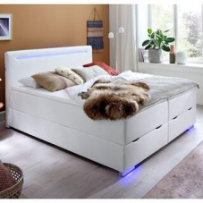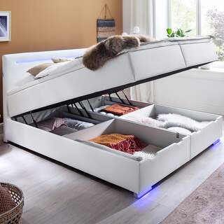 Freuen Sie sich auf kuschelige Stunden im wundervollen Boxspringbett Lindau. Optisch begeistert das Bett aufgrund seines faszinierenden Kopfteils mit LED-Beleuchtung. In seiner Ausführung sind: ein Bettkasten der leicht zu handhaben ist, Matratze, PU-Topper und ein USB-Anschluss im Kopfteil. Das weiße Bett bietet auf einer Liegefläche von 180 × 200 cm (B × L) großzügigen Platz, um es sich richtig gemütlich zu machen. Das Bett Lindau bringt erholsamen Schlaf und mehr Entspannung.