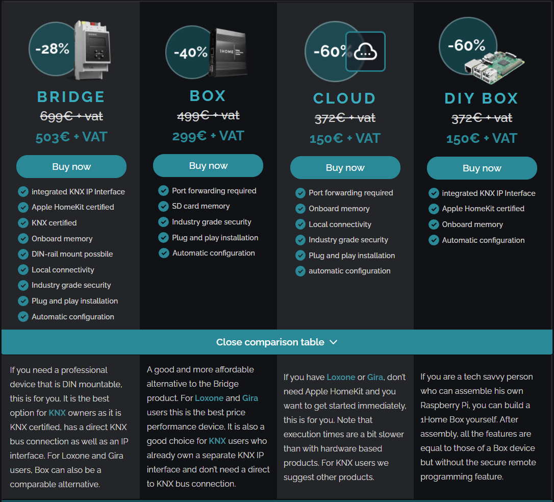 Bei 1home sind die Geräte aktuell reduziert. Wer ein KNX basiertes (oder Loxone & Gira) smart home hat, kann mit den Geräten und Diensten von 1home Apple HomeKit, Amazon Alexa und Google Home anbinden. Die Rabatte reichen von 28 bis 60%: