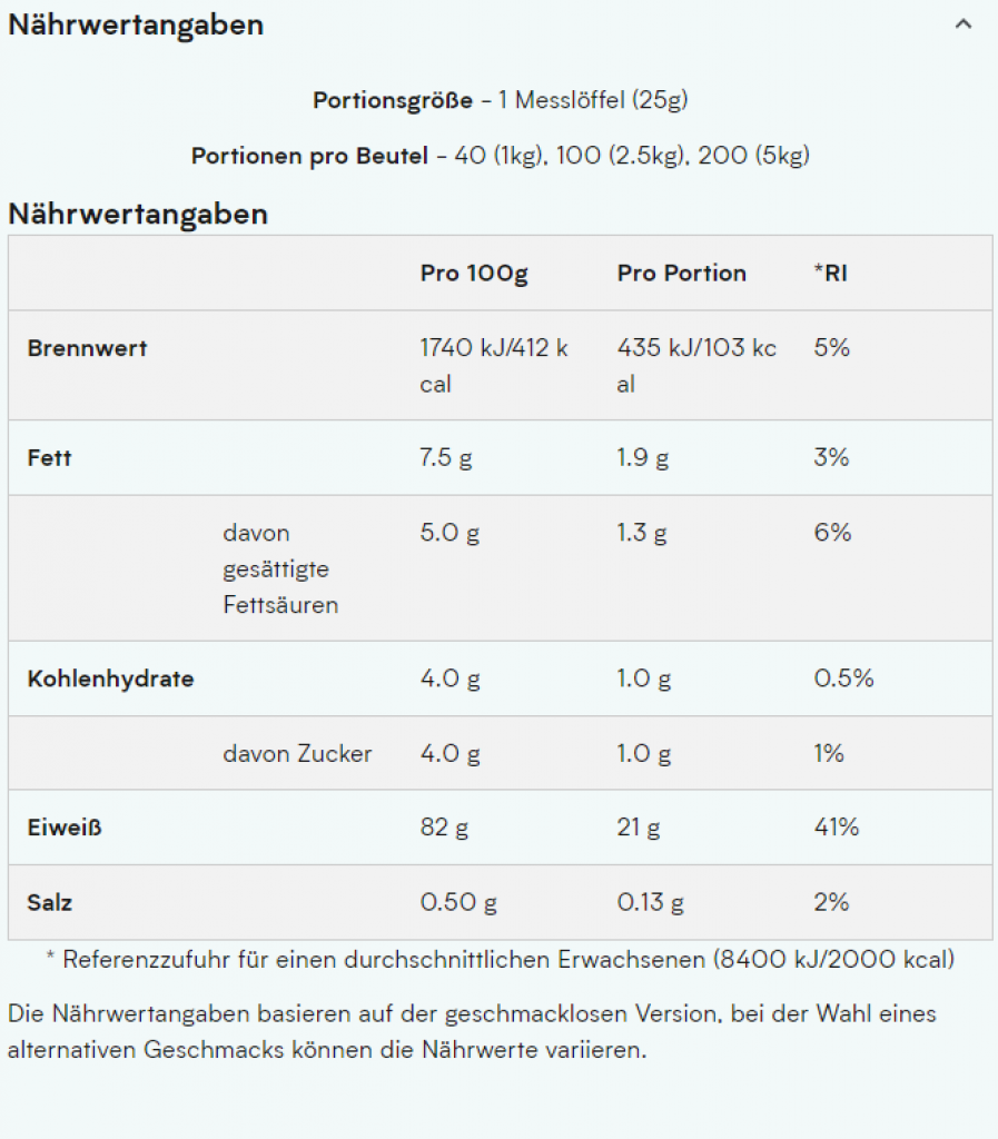 Ein bisschen viel Zucker und Fett, möchte das jeweils selber wählen können durch Einnahme von Baumnüssen (Öl), Olivenöl, Mandeln, Kakaonibs, Früchte, etwas Honig schlecken etc... LeeSport Whey Isolate nehme ich.