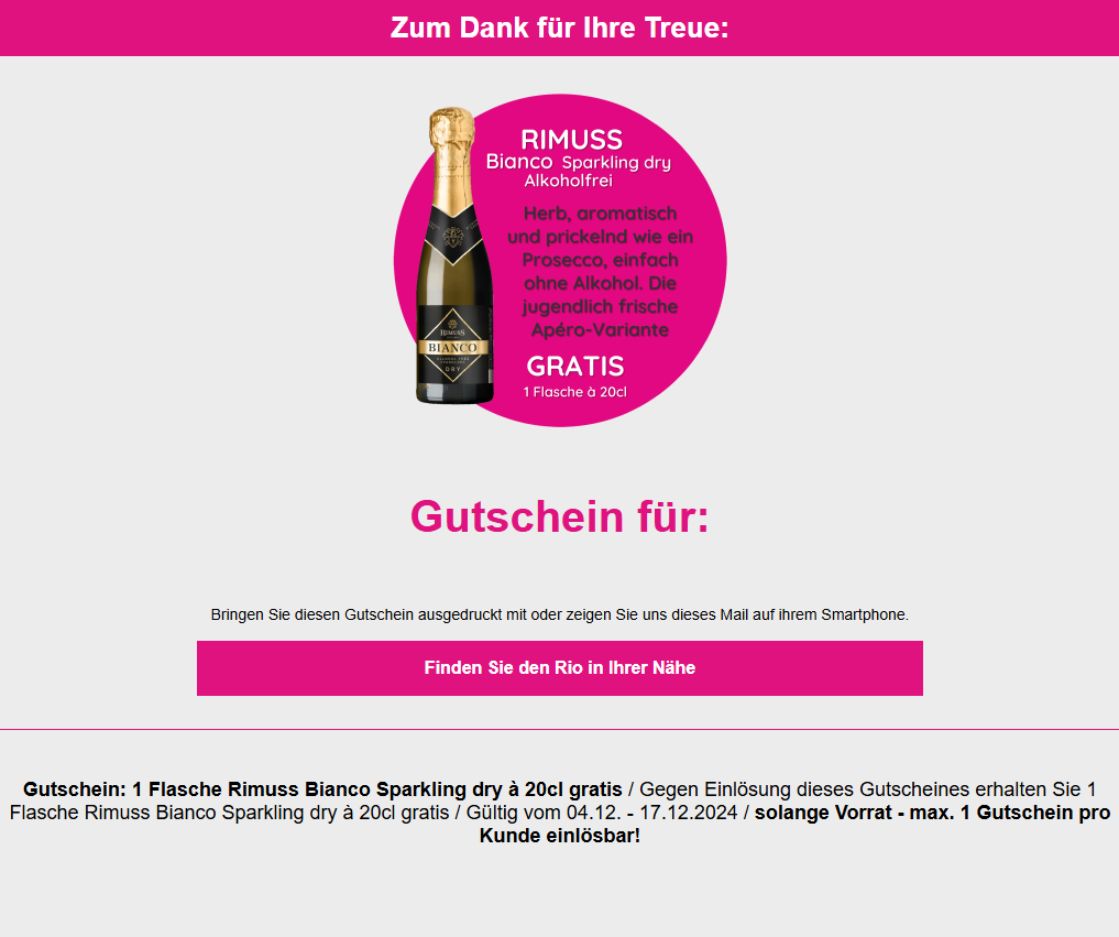 Ab heute könnt ihr bis zum 17.12. wieder etwas beim RIO Getränkemarkt gratis abholen! Folgenden Gutschein sollten alle Newsletter-Abonnenten erhalten haben: