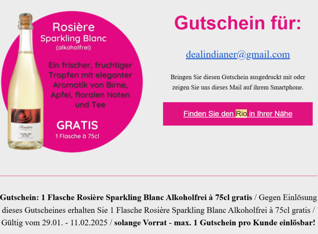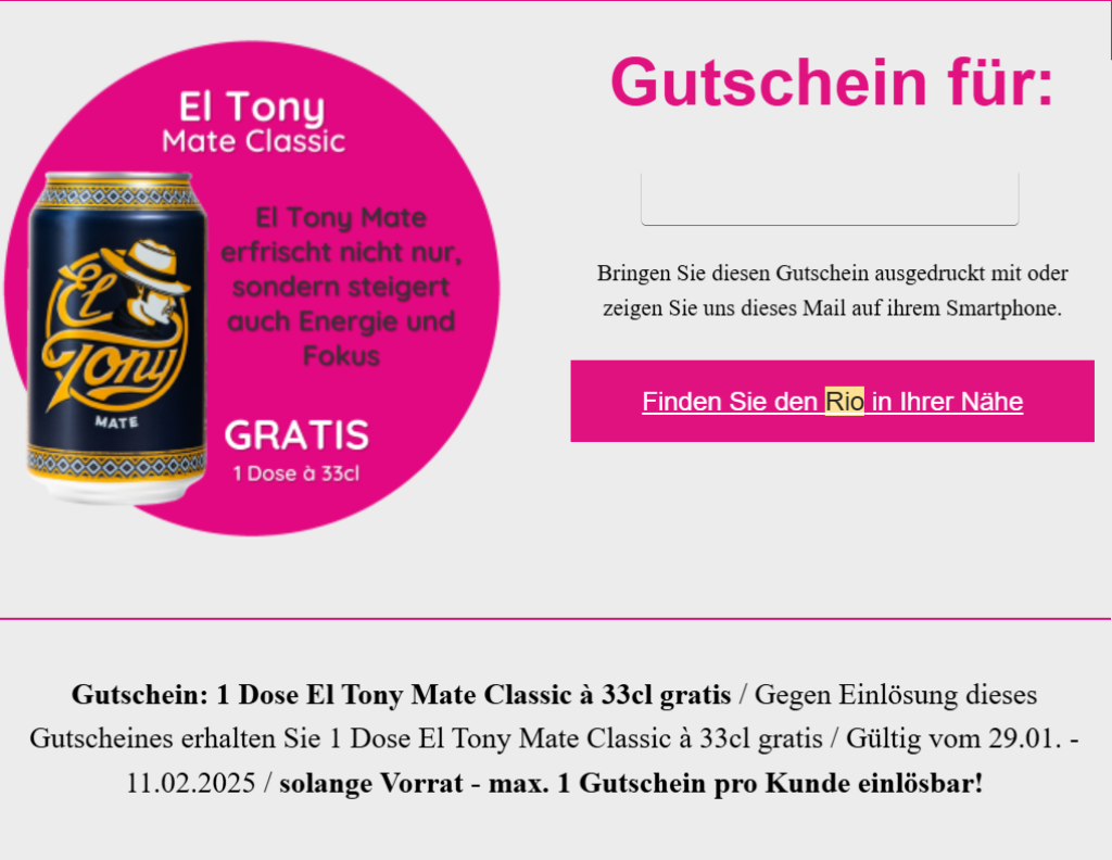 Bei Rio Getränke gibt es aktuell wieder kostenlose Getränke, von denen ihr profitieren könnt. Ihr könnt euch 1 Flasche Rosière Sparkling Blanc Alkoholfrei (75 cl) und 1 Dose El Tony Mate Classic (33 cl) gratis in einem Rio-Laden abholen. Einfach den Gutschein an der Kasse vorzeigen.