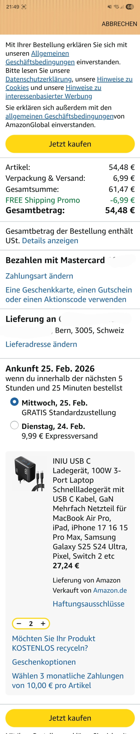 Momentan gibt es bei Amazon INIU USB C Ladegerät, 100W 3-Port Laptop Schnellladegerät mit USB C Kabel für 27.41 CHF + 6.39 CHF Versand (insgesamt 33.80 CHF). Wenn man jedoch zwei Stück in den Warenkorb legt und zur Kasse geht, zahlt man für beide zusammen nur 27.95 CHF. Das entspricht einem Preis von 13.98 CHF pro Stück
