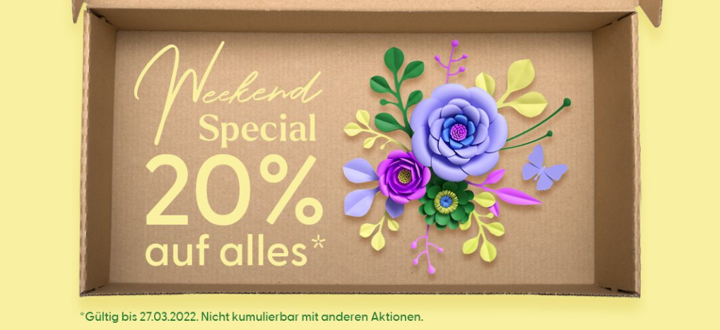 Das gesamte Sortiment ist um 20 % reduziert. Es wird kein Code benötigt und die Preise sind direkt im Shop angepasst.
