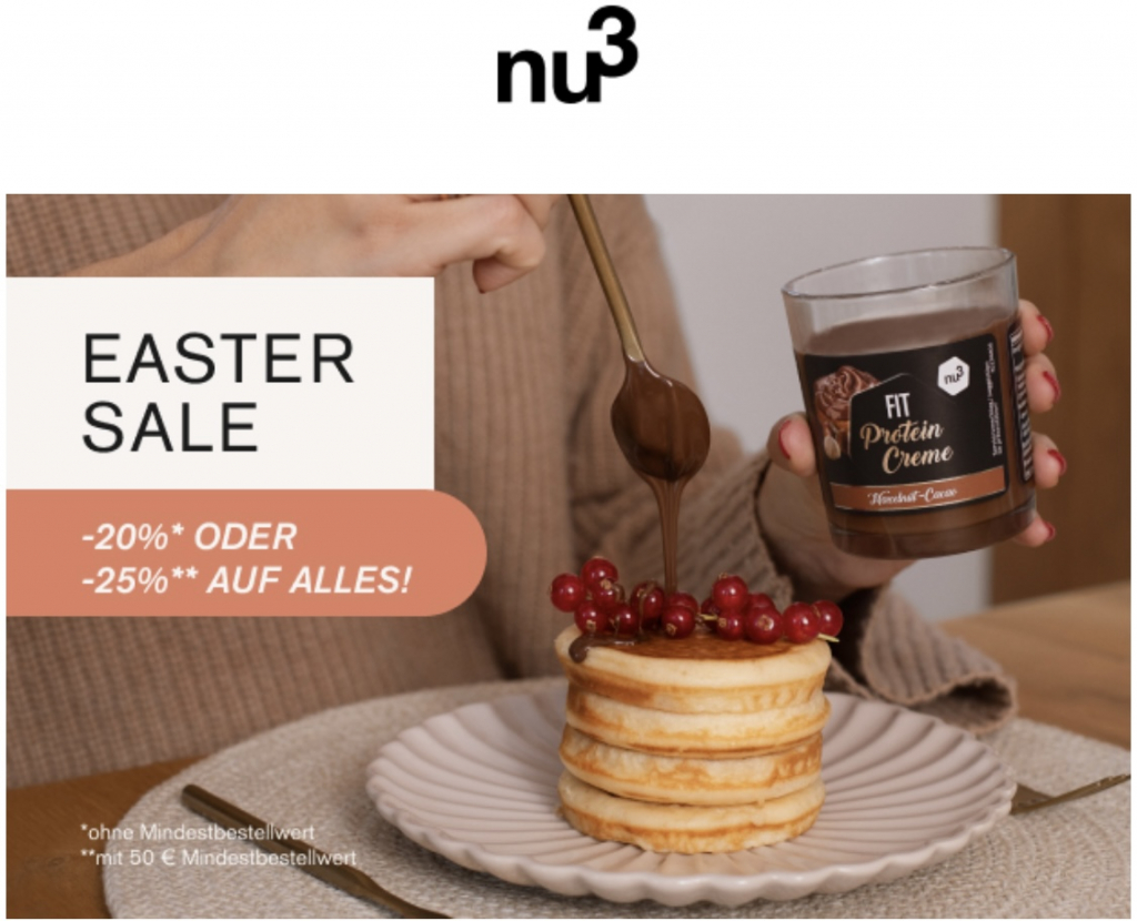 Zwei Rabattcodes auf Nu3, einmal 20% ohne Mindesbestellwert und 25% mit einem Mindestbestellwert von 60 CHF, Rabattcode in Warenkorb einfügen.