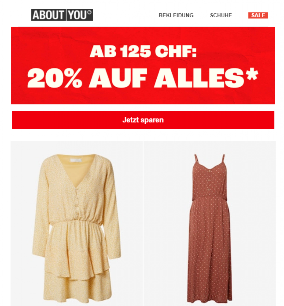 Diese Aktion läuft bis zum 18.08.2021 (23:59 Uhr). Im Aktionszeitraum gewähren wir, mit dem Gutscheincode SAVE20, 20% Rabatt. Einzelne Artikel können von der Aktion ausgeschlossen sein. Es gilt ein Mindestbestellwert von 125 CHF. Der Gutschein ist nicht übertragbar und kann nur in Kombination mit einer Bestellung bei ABOUT YOU eingelöst werden. Der Gutschein wird automatisch, bei Angabe des Gutschein-Codes vor Bestellabschluss, von der Rechnung abgezogen. Im Falle einer vollständigen Retoure verfällt der Gutscheinwert. Bei einer teilweisen Retoure erfolgt eine Anrechnung des Gutscheins nur, wenn der Mindestbestellwert bei den behaltenen Artikeln erreicht wird. Der Gutschein gilt nicht für Kosmetik- und Pflegeprodukte, für die Kategorie ‚Second Love‘, für Stoffmasken und für folgende Marken: Boss Casual, Boss Home, Boss Athleisure, Burberry, Diesel, Drykorn, Emporio Armani, Garmin, Hugo, Maloja, Mammut, Mango, Mango Kids, Mango Man, Max Mara Leisure, Michael Kors, MICHAEL Michael Kors, Oakley, Patagonia, Patrizia Pepe, PEAK PERFORMANCE, Ray-Ban, Samsoe & Samsoe, the kooples, THE KOOPLES SPORT, Versace, violeta by Mango, Vogue Eyewear, Weekend Max Mara. Der Gutschein gilt nicht in Verbindung mit anderen Rabatten und Gutscheinen. Ansprüche auf anteiligen oder vollständigen Ersatz eines Gutscheins bestehen nicht.