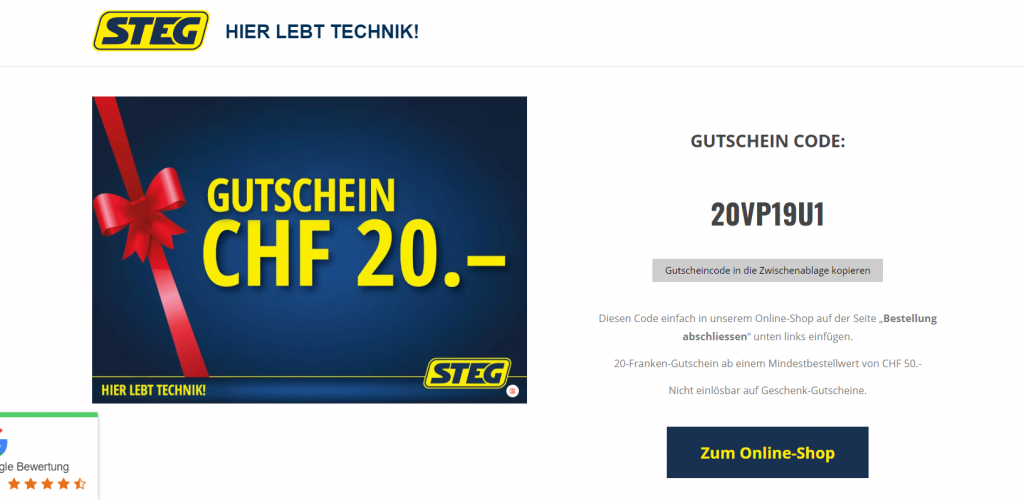 Zum Umbau der Filiale Visp gibt’s bei Steg wieder einmal einen 20.- Gutschein. Gültig ab einem Mindestbestellwert von CHF 50.-