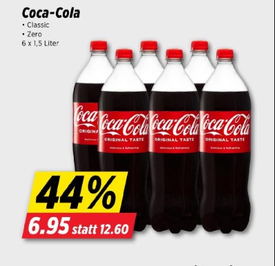 Weiter gibt es Coca Cola Classic oder Zero 44% günstiger und zum Preis von CHF 6.95 anstatt CHF 12.60.