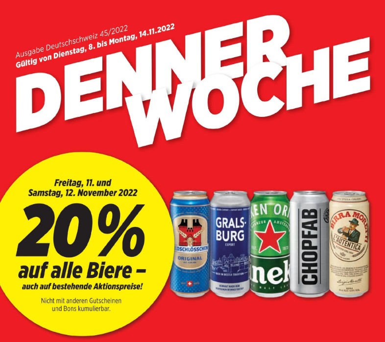 Bei Denner profitiert ihr diese Woche wieder von spannenderen Angeboten auf Lebensmittel. Zum Beispiel gibt es dieses Wochenende wieder 20% auf alle Biere.