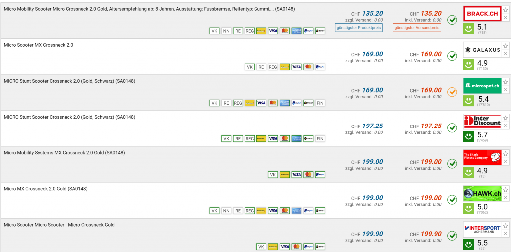 Bei Brack gibt’s gerade 20% Rabatt auf alle Micro Mobility Scooter. Bei einigen Preisen ist Galaxus mitgezogen, die meisten weiteren Micro Scooter gibt’s sonst im Moment nirgends günstiger.