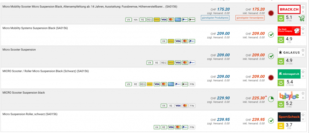 Bei Brack gibt’s gerade 20% Rabatt auf alle Micro Mobility Scooter. Bei einigen Preisen ist Galaxus mitgezogen, die meisten weiteren Micro Scooter gibt’s sonst im Moment nirgends günstiger.