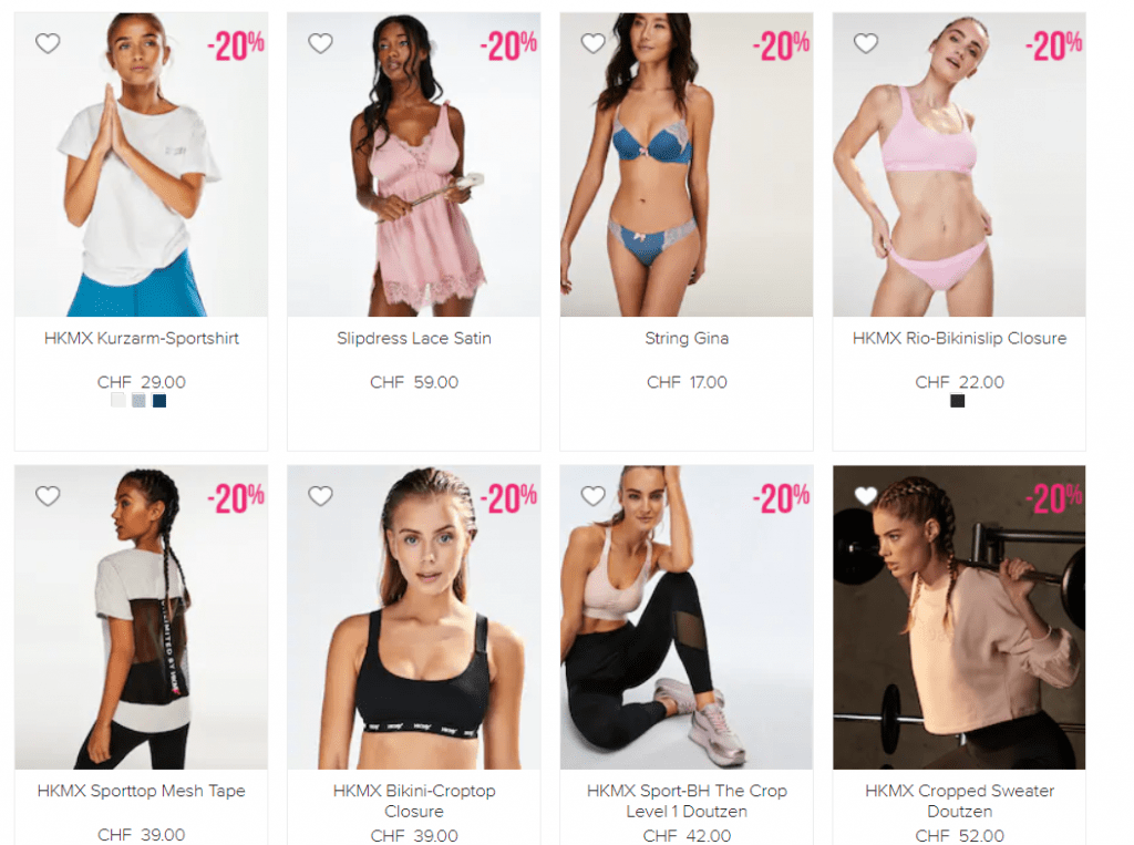 Bei Hunkemöller gibt’s zum Abschluss der Fashion Week 20% Rabatt aufs gesamte Sortiment. Bemerkenswert, weil der Rabatt auf die ganz neu erschienene Kollektion gilt. Der Deal ist ohne Gutscheincode gültig, der Rabatt wird direkt im Warenkorb abgezogen. Gültig bis und mit Sonntag.