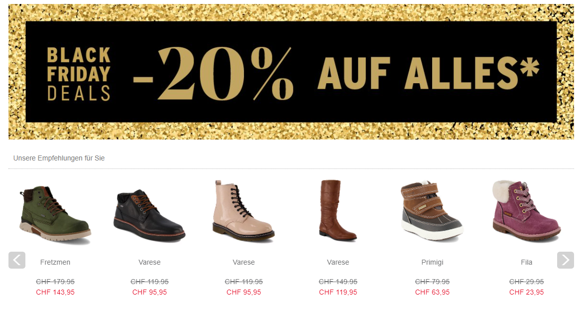 Bis zum 29.11. gibt es bei Ochsner Shoes ein Black Friday Special. Das gesamte Sortiment ist um 20% reduziert. Es gibt keine weiteren Einschränkungen und es muss kein MBW erreicht werden.