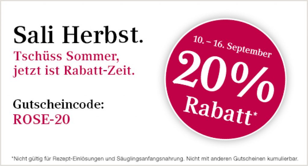 Bis am Sonntag gibt’s bei der Onlineapotheke Zur Rose mit dem Gutscheincode ROSE-20 20% Rabatt aufs ganze Sortiment. Ausgenommen sind rezeptpflichtige Medikamente sowie Säuglingsnahrung.