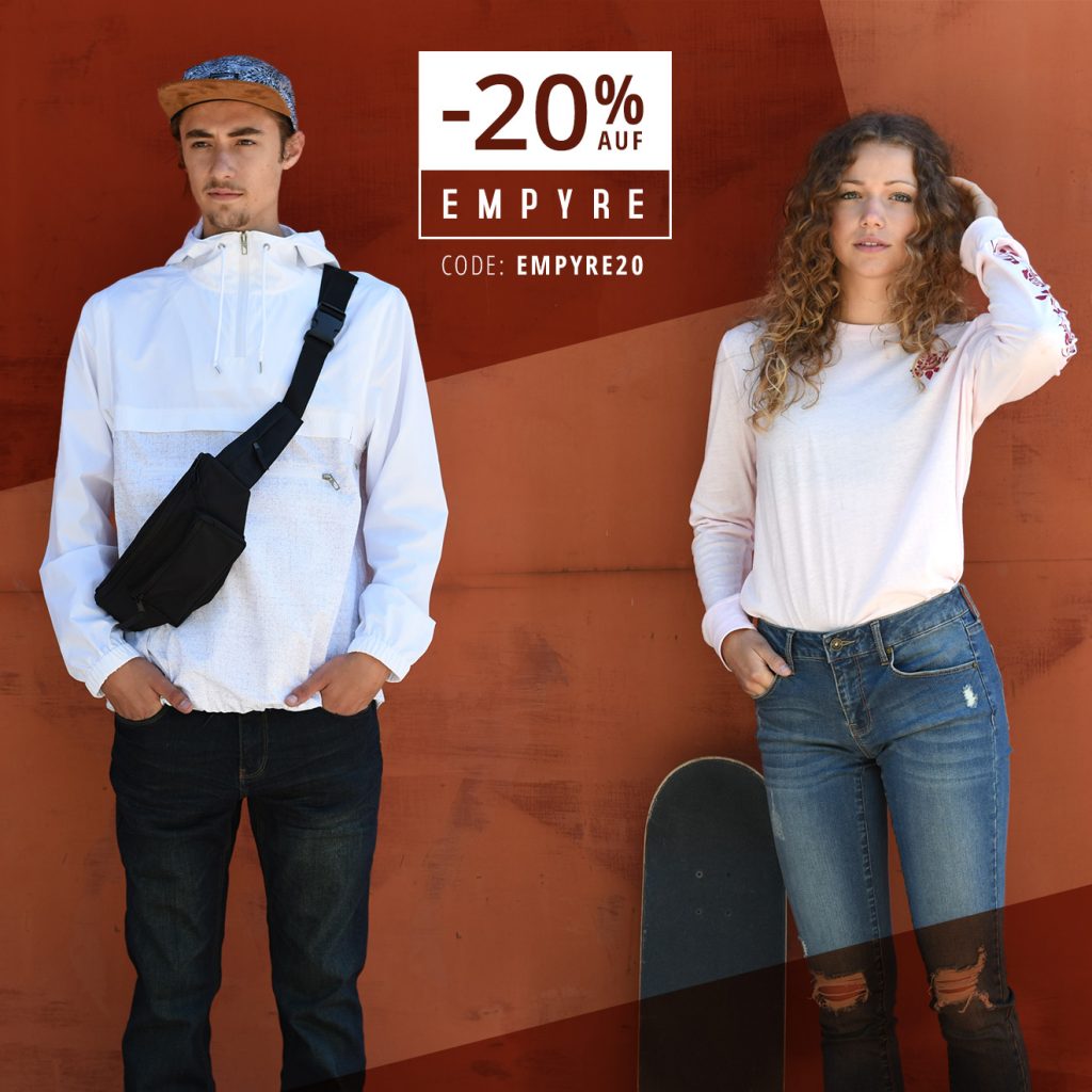 Um von der Aktion zu profitieren, musst du den Code „EMPYRE20“ angeben. In der Kollektion findest du moderne Freizeitkleidung für Damen und Herren. Alles ist im Surfer-Stil gehalten, sodass es etwa auch Boardshorts gibt.