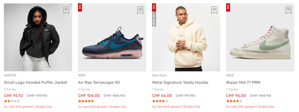 Nur heute gibts zum Singles Day bei Snipes 20 % auf ein ausgewähltes Sortiment. Insgesamt sind knapp 3000 Artikel im Angebot. Natürlich nur solange der Vorrat reicht. Ein Code wird nicht benötigt und es muss auch kein MBW erfüllt werden.