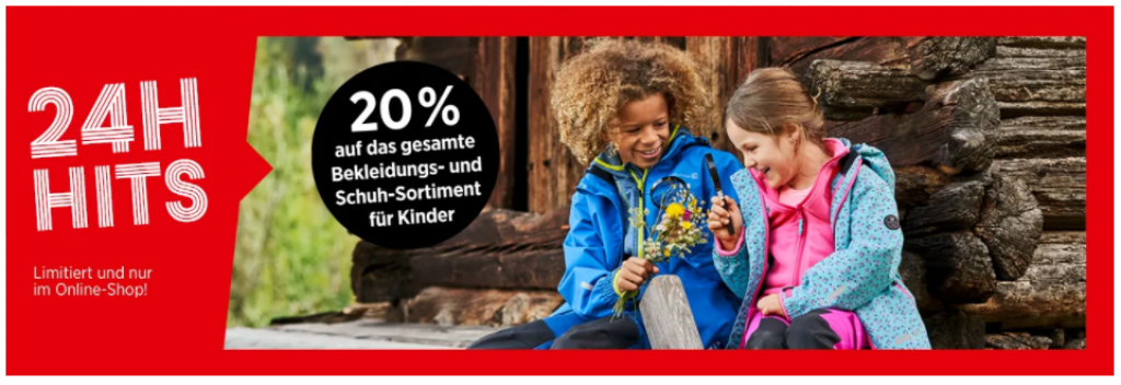 Nur heute ist das gesamte Bekleidungs- und Schuhsortiment für Kinder bei SportXX um 20% reduziert.