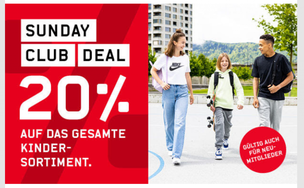 Bist du auf der Suche nach der passenden Sportausrüstung für deine Kids? Als CLUB Mitglied oder Neu-Mitglied profitierst du nur heute von 20% auf das gesamte Kindersortiment. Ob ein Fussballshirt für kleine Kicker, Fahrradhelme für Velofans oder einfach ein paar neue Kinderschuhe: in unserem Sortiment findest du alles für den Sportnachwuchs.