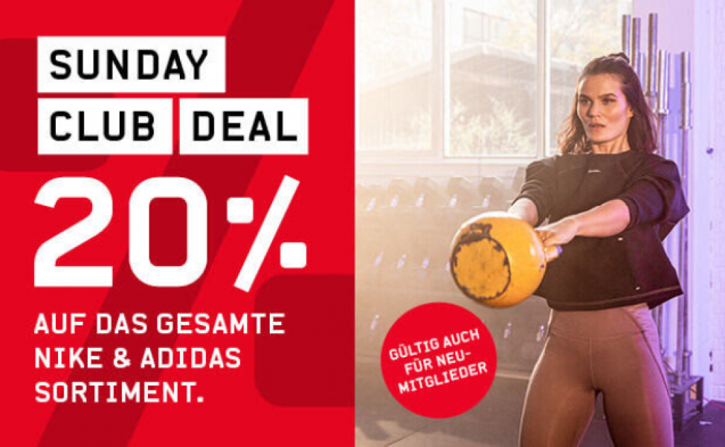 Im Fitness, beim Yoga, joggend im Wald oder doch lieber auf Wanderwegen unterwegs? Egal, für welche Sportart dein Herz schlägt: Bei Nike & adidas findet jede Sportlerin das passende Outfit und die notwendige Ausrüstung für ihre Sporteinheiten. Sichere dir nur heute 20% auf das gesamte Sortiment von Nike & adidas.