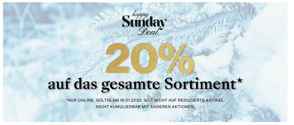Das gesamte Sortiment ist um 20 % reduziert, nur Sale Artikel sind ausgenommen.
