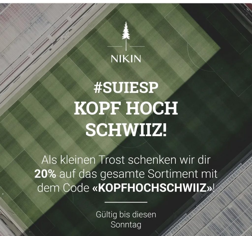 Gültig bis diesen Sonntag 20% auf das gesamte Nikin Sortiment mit dem Code KOPFHOCHSCHWIIZ. Als kleiner Trost für das Ausscheiden der Schweiz. Evtl. kombinierbar mit dem Newsletter (10%), das habe ich aber nicht geprüft.