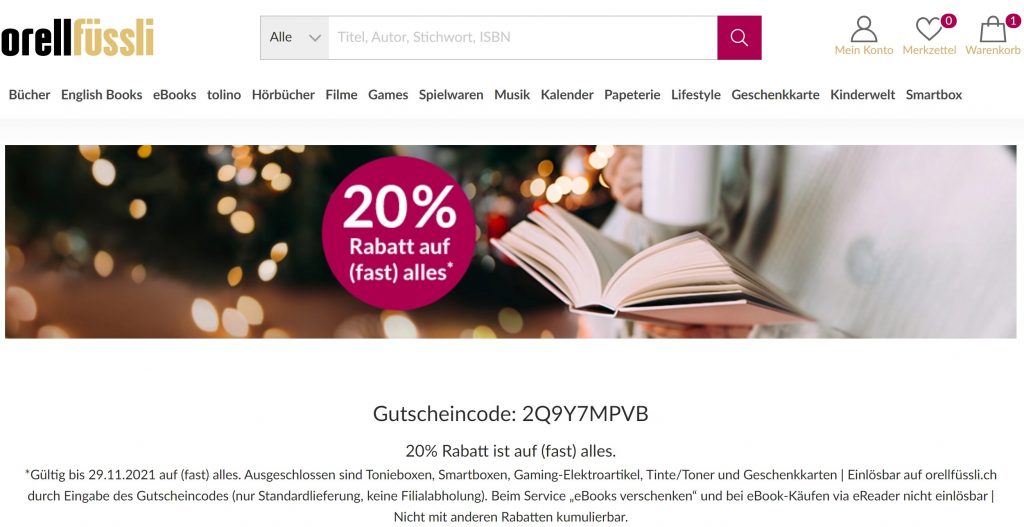 Bei www.orellfüssli.ch gibt es bis am 29. November 2021 20% Rabatt auf (fast) alles. Auch auf eReader gültig. Webshop-Code: 2Q9Y7MPVB