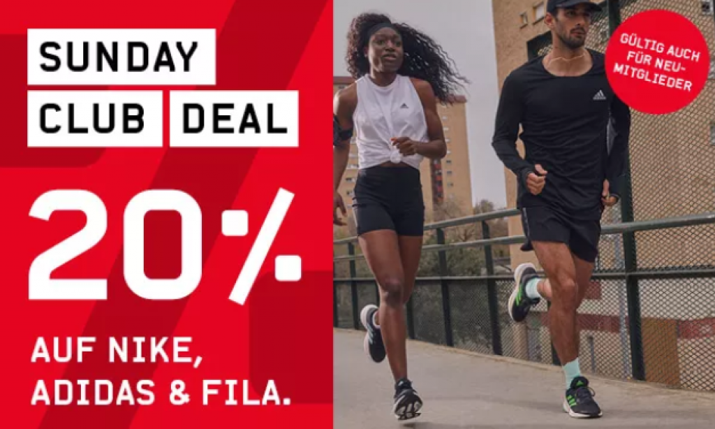 Club- & Neumitglieder erhalten 20 % auf Produkte von Nike, Adidas und Fila. Die Aktion ist nur heute gültig.