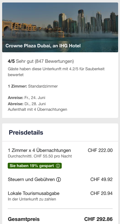 Als Beispiel: Zwei Personen übernachten für vier Nächte im 4-Sterne Hotel Crowne Plaza Dubai für insgesamt CHF 293.