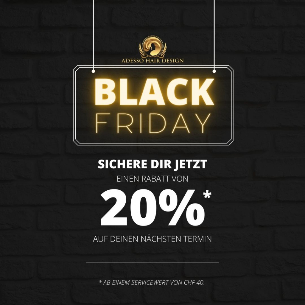 Adesso Hair Design und Amici Hair Design bieten exklusiv am Black Friday mit dem Gutscheincode BLACK 20% an (Termin kann aber auch in der Zukunft liegen). Gemäss Inserat gültig ab einem Servicewert von CHF 40.-. Insgesamt haben die 11 Standorte in der Schweiz. Kann über die Online Terminbuchung oder telefonisch eingelöst werden.