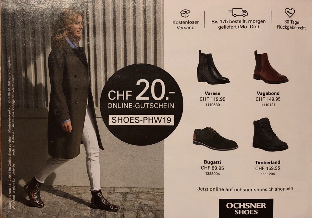 Mit dem Code SHOES-PHW19 erhält man 20 CHF Rabatt (Mindestbestellwert 99.90 CHF) auf die Bestellung (nur reguläre Ware), gültig bis 31.12.2019.