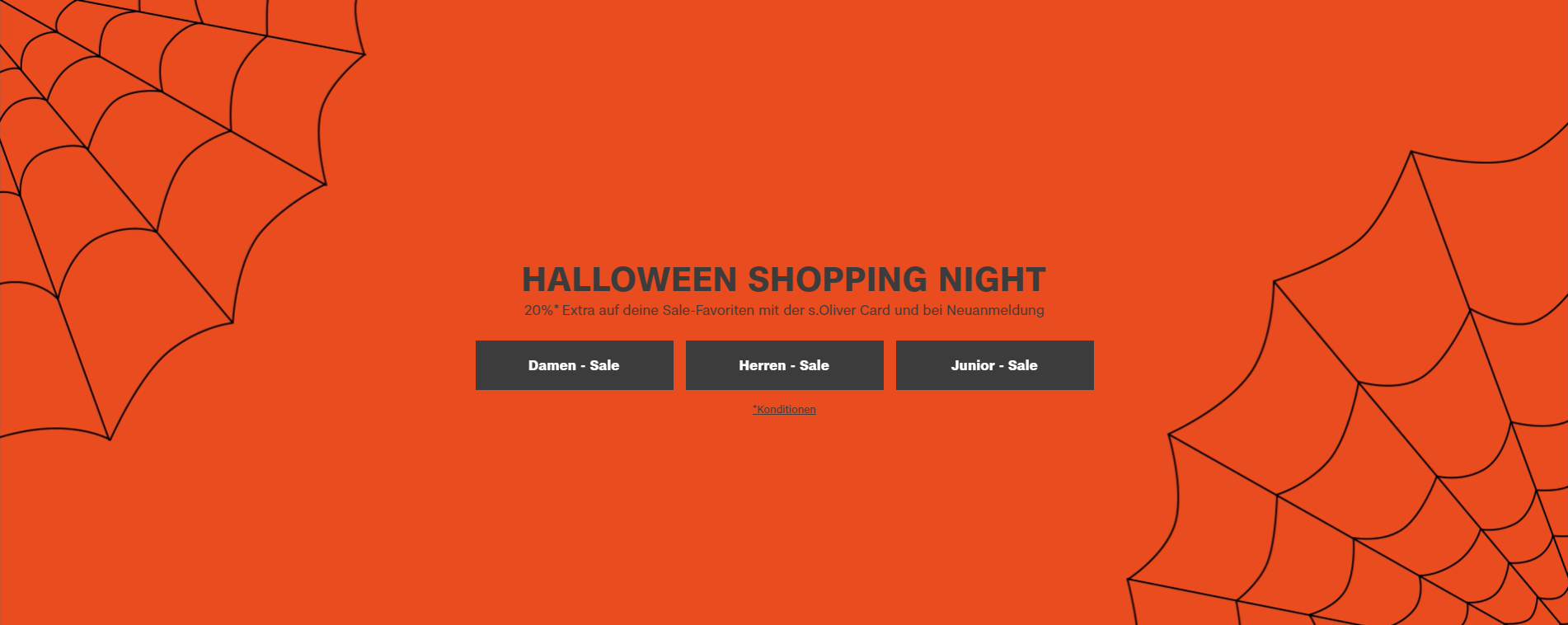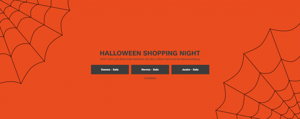Von Sonnenuntergang bis Sonnenaufgang gibt es mit dem Code HALLOWEEN 20% extra Rabatt auf Artikel im Sale, mit der s.Oliver Card und für alle Neuanmeldungen.