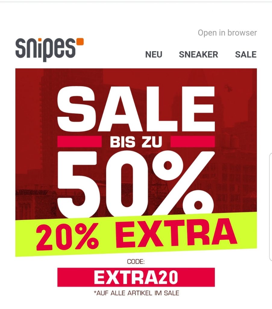 Angebot leider abgelaufen! Jeden Tag findet die Deal-Community neue Angebote. Sehen Sie sich jetzt die neuen Aktionen an... Zu den aktuellen Deals Fashion & SchmuckSnipes Abgelaufen20 % Extra bei Snipes Geschrieben von rimek vor 5 Jahren Fashion & Schmuck 2. März 2021 6 0 Zum Deal EXTRA20 Abgelaufen Auf alles was im Sale ist, gibt es noch einmal 20% extra. Die besten Deals von heute anzeigen rimek 765 Vollständiges Profil anzeigen