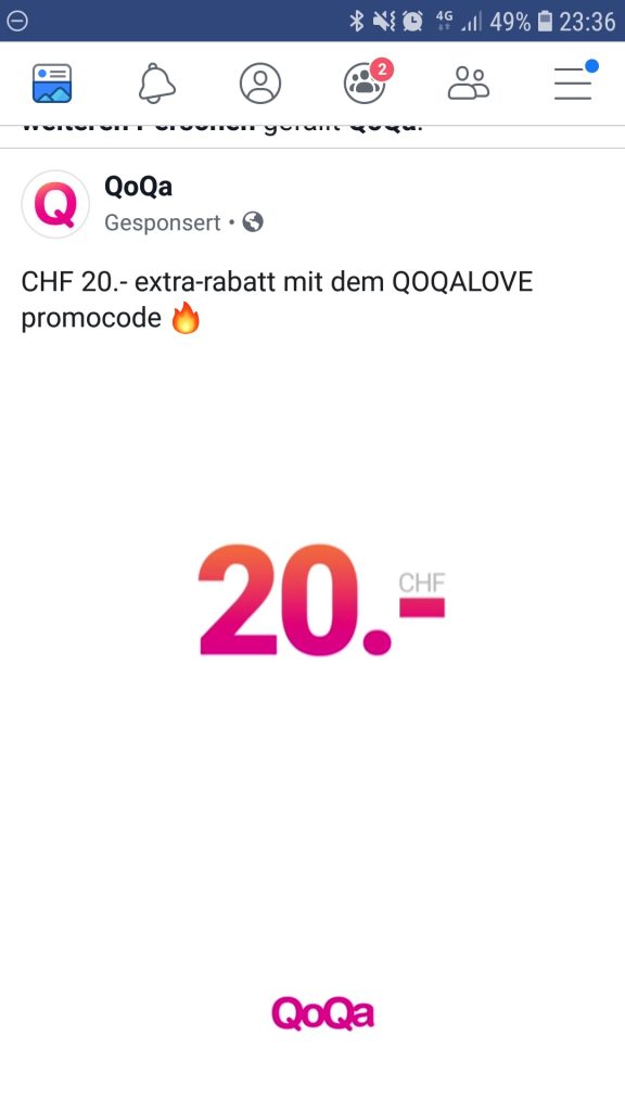 Bei QoQa gibt’s laut Facebook mit dem Code QOQALOVE 20.- Rabatt auf die nächste Bestellung. Leider nicht angegeben ist, ob es einen Mindestbestellwert gibt. Ebenfalls steht leider nirgends, bis wann der Code gilt.