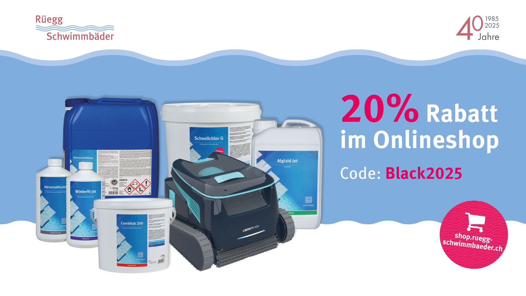 Mit dem Code Black2025 jetzt 20% Rabatt auf Wasserpflegemittel, Poolroboter & Zubehör im Rüegg Onlineshop sparen! 24. Nov. - 01. Dez. 2025