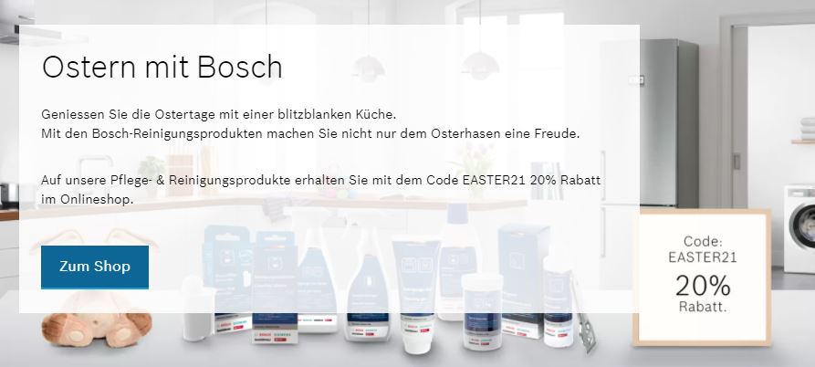 20% Rabatt im Bosch-Shop auf alle Pflege und Reinigungsprodukte. Wasserfilter, Geruchsfilter oder diverse Entkalker. Wer sich für den Frühlingsputz rüsten will.