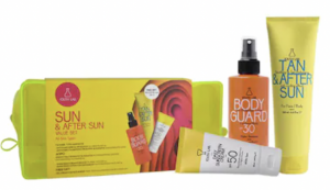 - ein Tan & After Sun (150 ml): Ein Creme-Gel mit angenehmem Kühleffekt, das die natürliche Bräune verstärkt und verlängert, die Haut repariert, Irritationen lindert, sie strahlender macht und mit Feuchtigkeit versorgt.