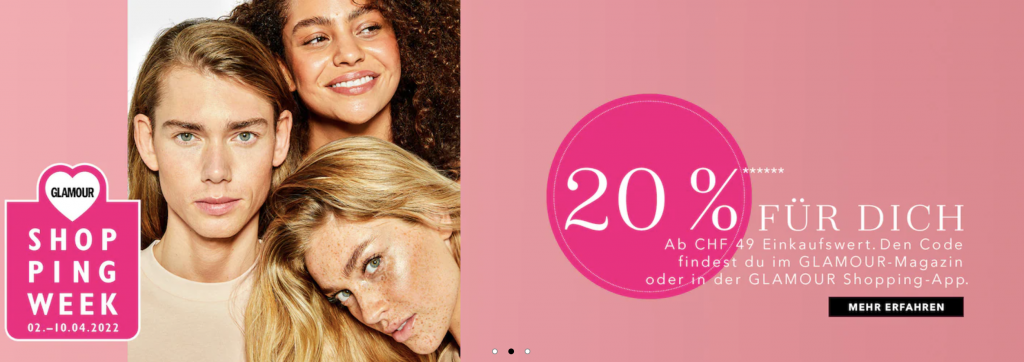 Während der Glamour Shopping Woche gibt es mit diesem Gutschein-Code 20% Rabatt ab einem Bestellwert von CHF 49.