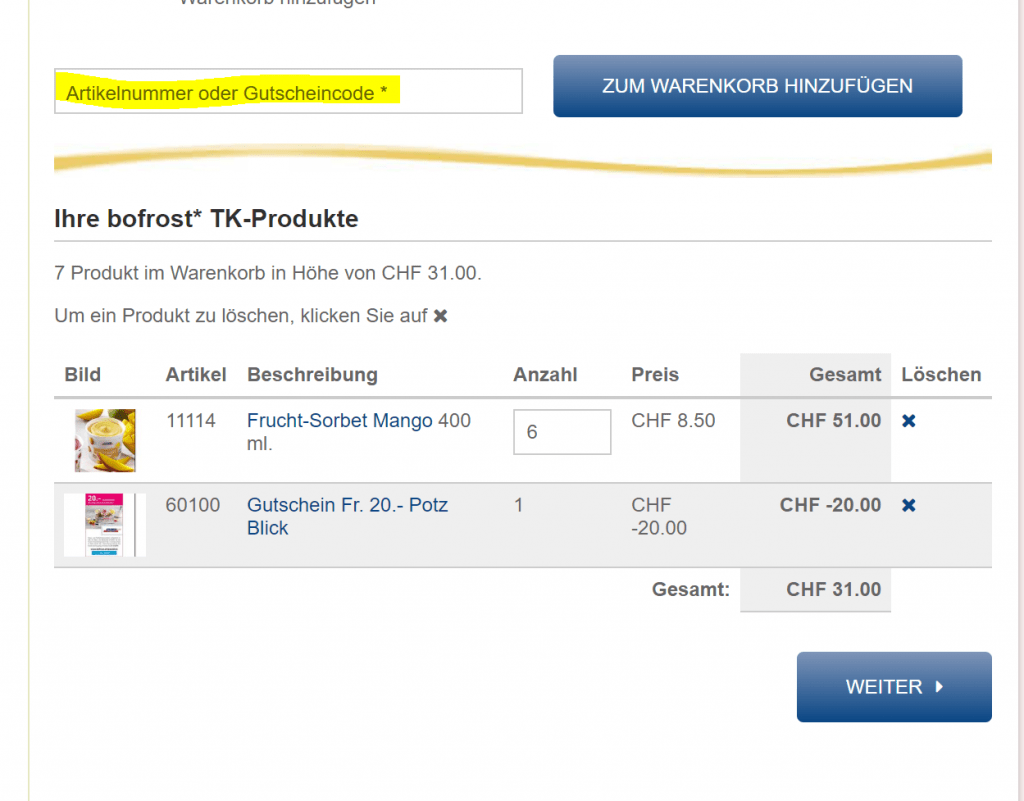 Bei bofrost erhält man bis am 31.07. mit dem Gutscheincode 60100 20.- Rabatt ab einem Mindestbestellwert von CHF 50.- Die Aktion gilt nur für Neukunden. Der Rabatt ist auch wegen der Gratislieferung interessant.