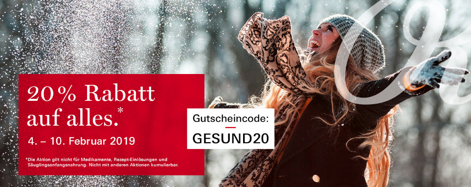 Bis zum 10.2.2019 gibt es bei der Onlineapotheke Zur Rose mit dem Gutscheincode GESUND20 20% Rabatt auf das ganze Sortiment. Ausgenommen sind rezeptpflichtige Medikamente sowie Säuglingsnahrung.