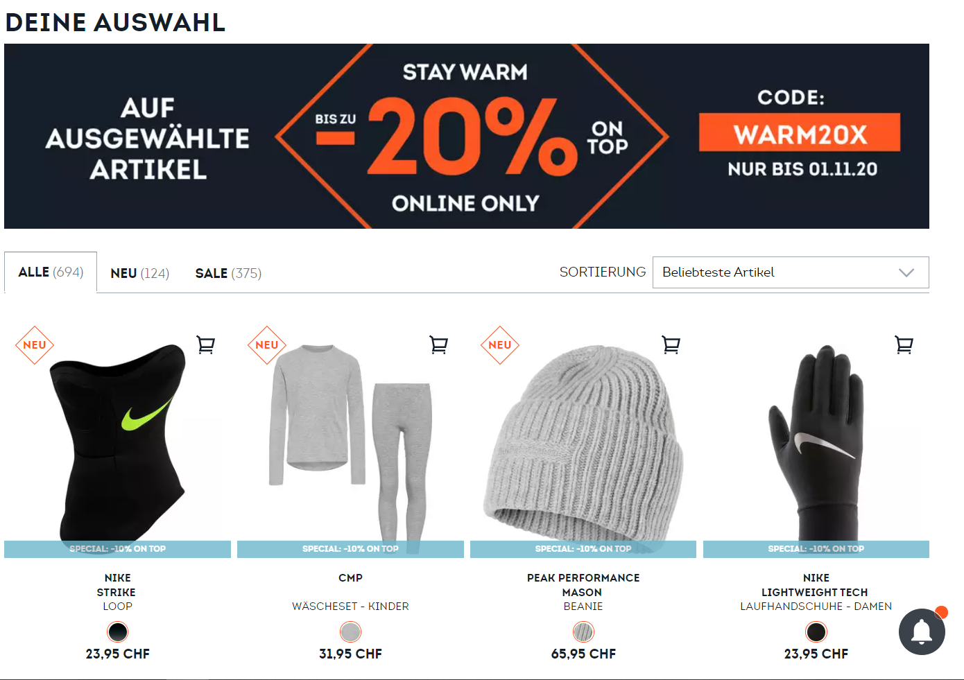 Bis zum 1. November gibts derzeit noch 20% Rabatt auf ausgewählte Artikel bei SportScheck. Der Gutschein ist nicht mit anderen Codes kombinierbar und die Aktion findet ausschliesslich im Onlineshop statt. Beachtet zudem, dass ihr bei einem Einkaufsbetrag unter 99 Franken die Versandkosten von CHF 5.95 begleichen müsst.