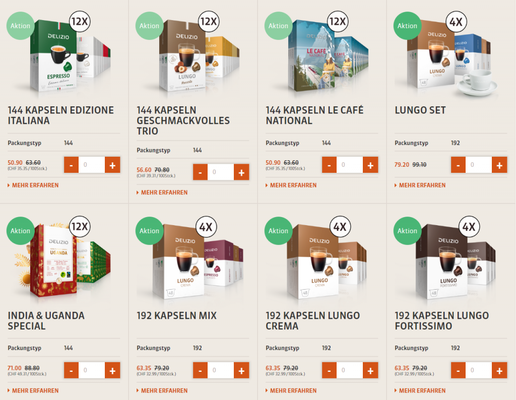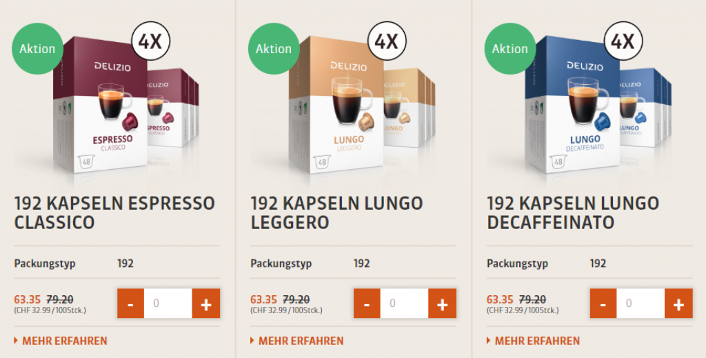 Bei Delizio gibts 20% Rabatt auf die Kaffeekapseln in den Big Pacs. Das heisst die Packungen mit 144 oder 192 Kapseln drin.
