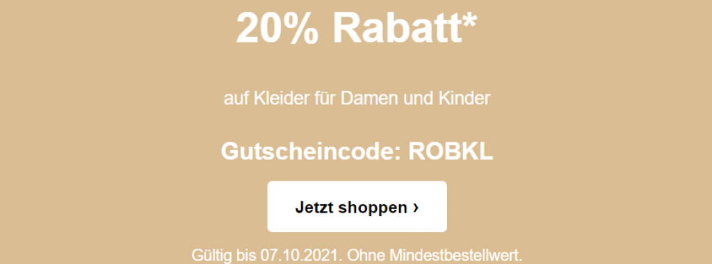 Gutschein (20% auf Kleider für Damen und Kinder, ausgenommen Sets) und gilt für alle Bestellungen. Ohne Mindestbestellwert. Bitte am Ende des Bestellvorgangs den Gutscheincode in das vorbereitete Feld eingeben. Gültig bis einschliesslich 07.10.2021.