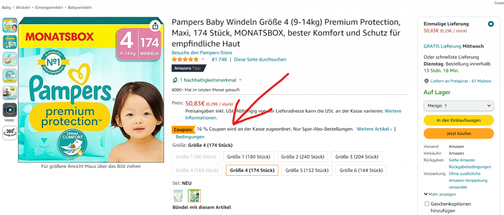Bei Amazon gibt es zurzeit 20% Rabatt auf Pampers mit dem Sparabo. Im Beispiel gibt es 174 Windeln für CHF 36.93 statt CHF 52.30 zu ergattern.