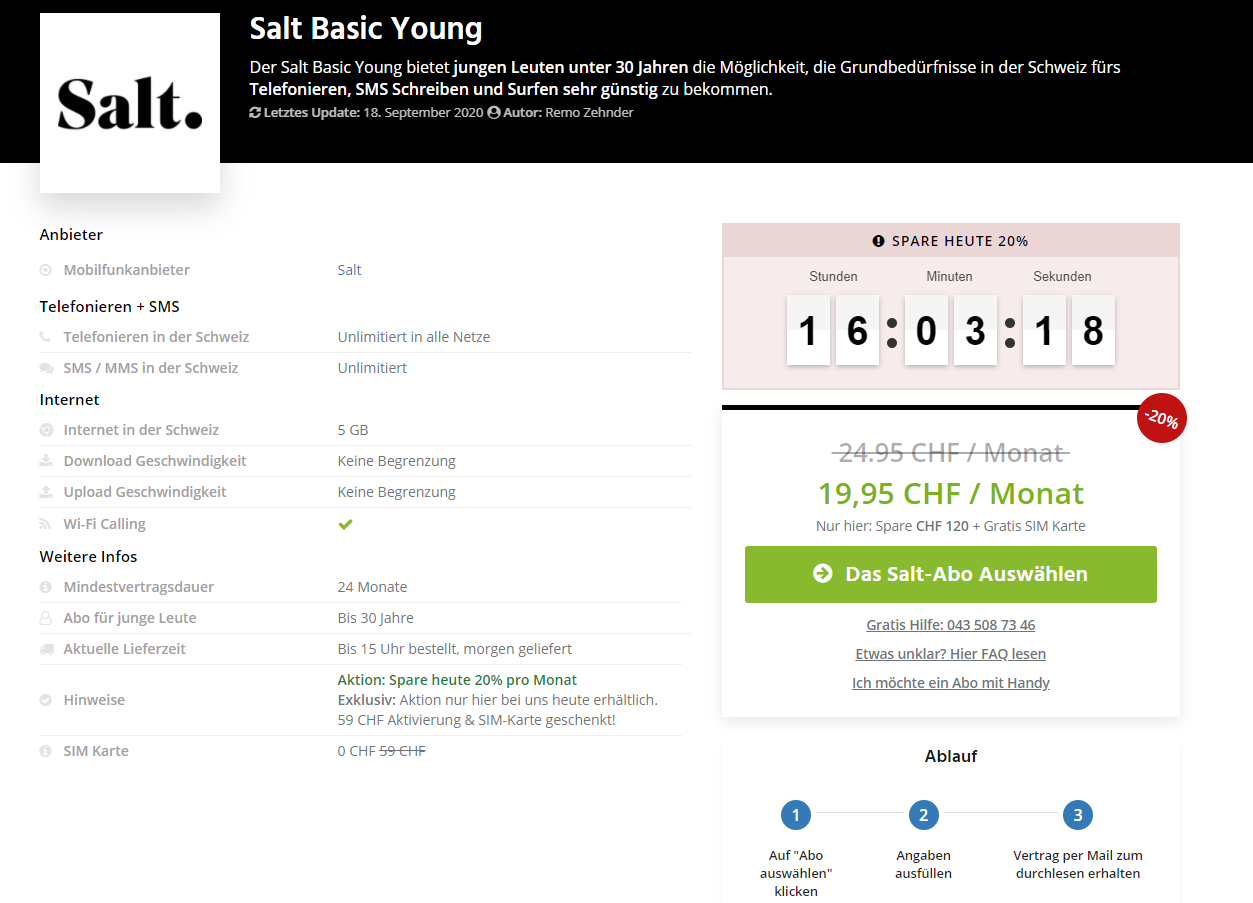 Nur heute gibt es bei handy-abovergleich.ch den Salt Basic Young Tarif um 20% günstiger.