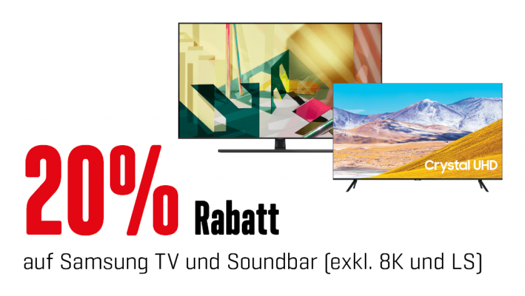 Ab heute bis und mit Sonntag 08.11.2020 gibt es bei Interdiscount 20% Rabatt auf Samsung TVs (exklusive 8K und LS). Somit dürften einige Bestpreise entstehen. Bis zum Sonntag gibt es ausserdem mit diesem Gutschein (2020-TRADING) nochmals CHF 15.- Rabatt ab CHF 150.-