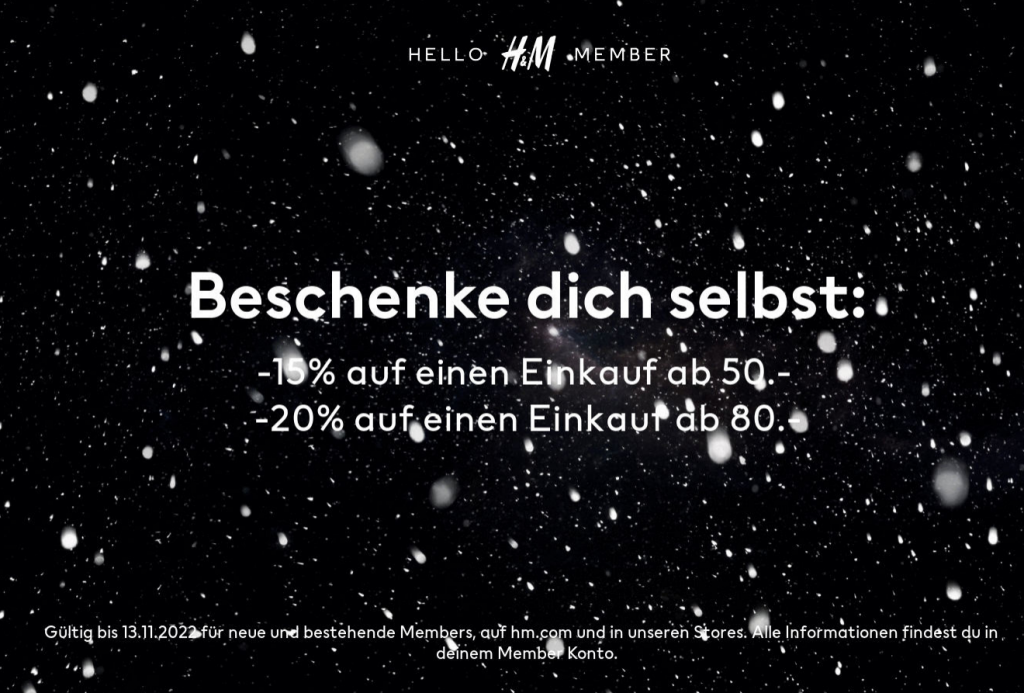 Bei H&M gibt’s bis am 13.11. 20% Rabatt ab einem Bestellwert bis CHF 80.- Das gilt online sowie in den Stores.