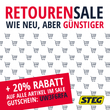 Bei STEG gibt es noch bis 27. April einen Retouren-Sale, bei dem man auf bereits günstige Retouren-Ware mit einem Gutschein-Code nochmals zusätzlich 20% Rabatt bekommt.