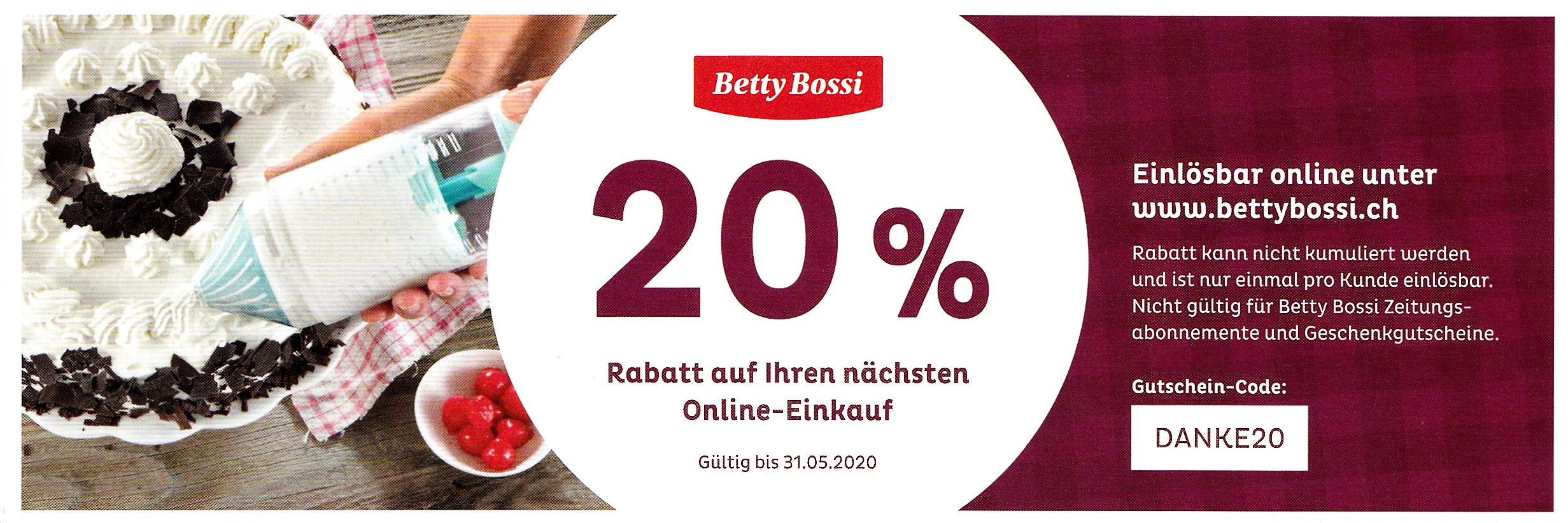 Mit dem Gutscheincode DANKE20 gibt es bis am 31. Mai 2020 einen Rabatt in Höhe von 20% auf den Einkauf bei bettybossi.ch. Das Beste daran ist, dass es hier keinen Mindestbestellwert gibt.
